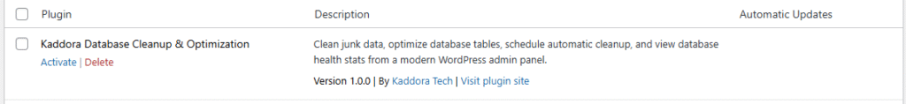 After successfully Installation & Activation of plugin, you will see βKaddora Database Cleanup & Optimization pluginβ in your installed plugin section, here you can check version and description about the plugin