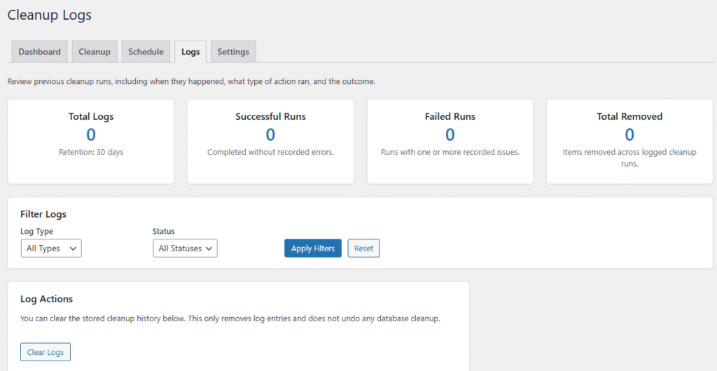 - Detailed Activity Logs β Records all database cleanup actions performed by the plugin.