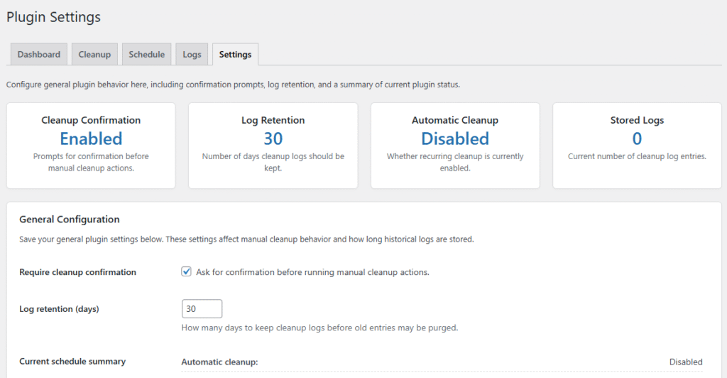 The settings panel is designed to provide safe database maintenance, performance improvements, and full control over database cleanup operations.