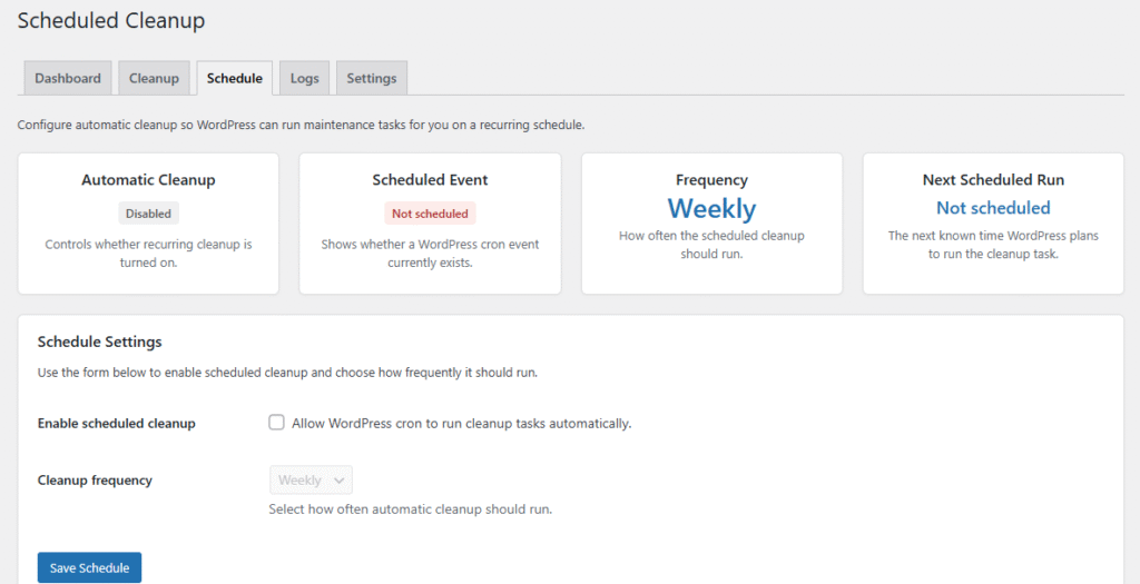 - Automatic cleanup scheduling mode β allows you to schedule regular database maintenance tasks so your database stays optimized without manual intervention.
