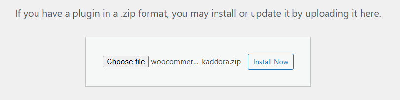 - Upload Plugin > Choose the woocommerce-filters-kaddora.zip plugin file and click Install Now.