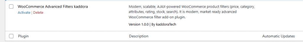 - After successfully Installation & Activation of plugin, you will see βWooCommerce Advanced Filters kaddoraβ in your installed plugin section, here you can check version and description about the plugin.
