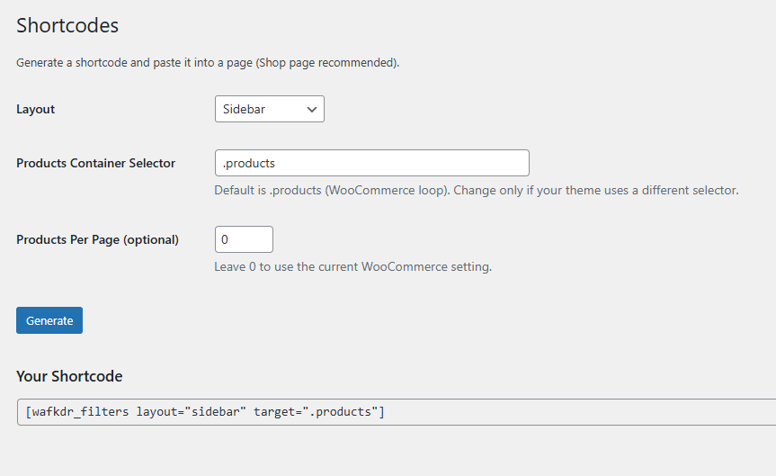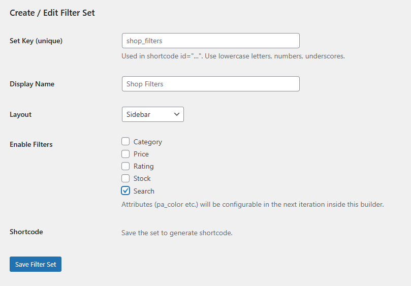 Filter Set Shortcode “[wafkdr_filters id=”shop_filters]”