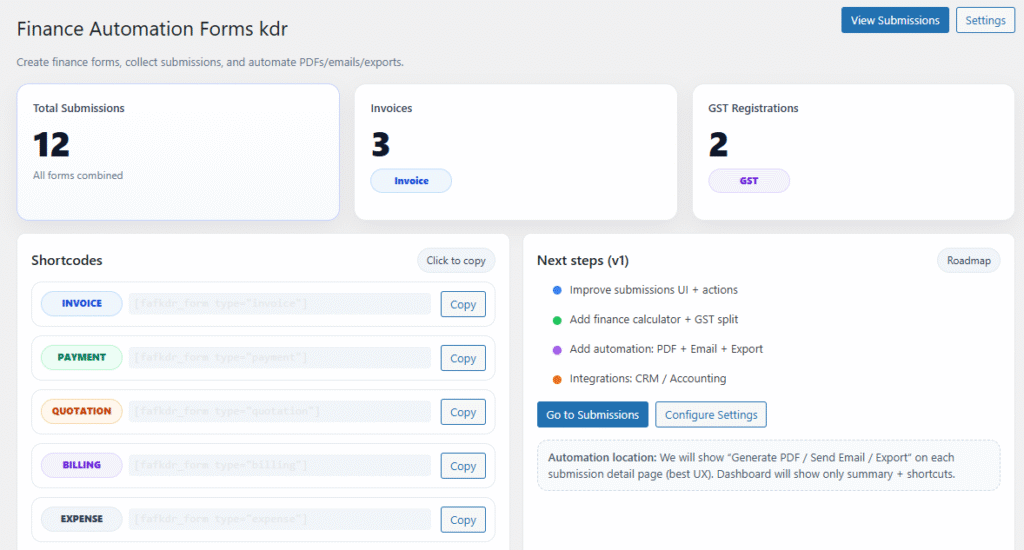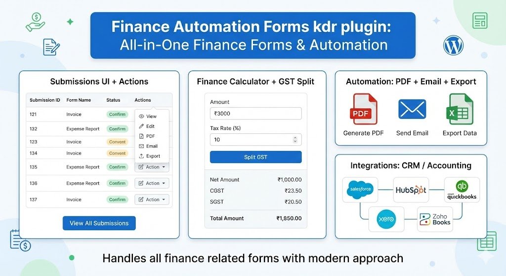 Finance Automation Forms kdr is a modern WordPress plugin designed to simplify the collection and management of financial information through structured online forms. It provides ready-to-use forms for invoices, billing, payments, quotations, expenses, and GST registrations, all accessible via simple shortcodes. Submitted data is securely stored in WordPress and presented in a clean admin dashboard with detailed views and export options. The plugin helps businesses streamline finance-related workflows without relying on external tools. Its modular architecture also prepares your site for future automation features like PDF generation, email notifications, and integrations. Ideal for accountants, agencies, and service businesses needing organized financial data capture directly on their website.