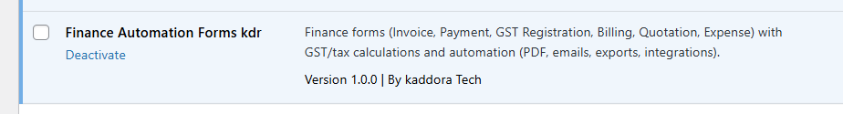 - After successfully Installation & Activation of plugin, you will see βFinance Automation Forms kdrβ in your installed plugin section, here you can check version and description about the plugin
