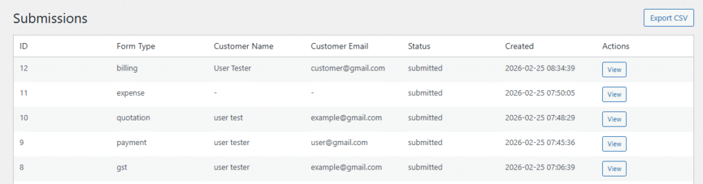 2. Submissions– Find list of Form Submissions with View button having information about Form details.